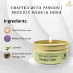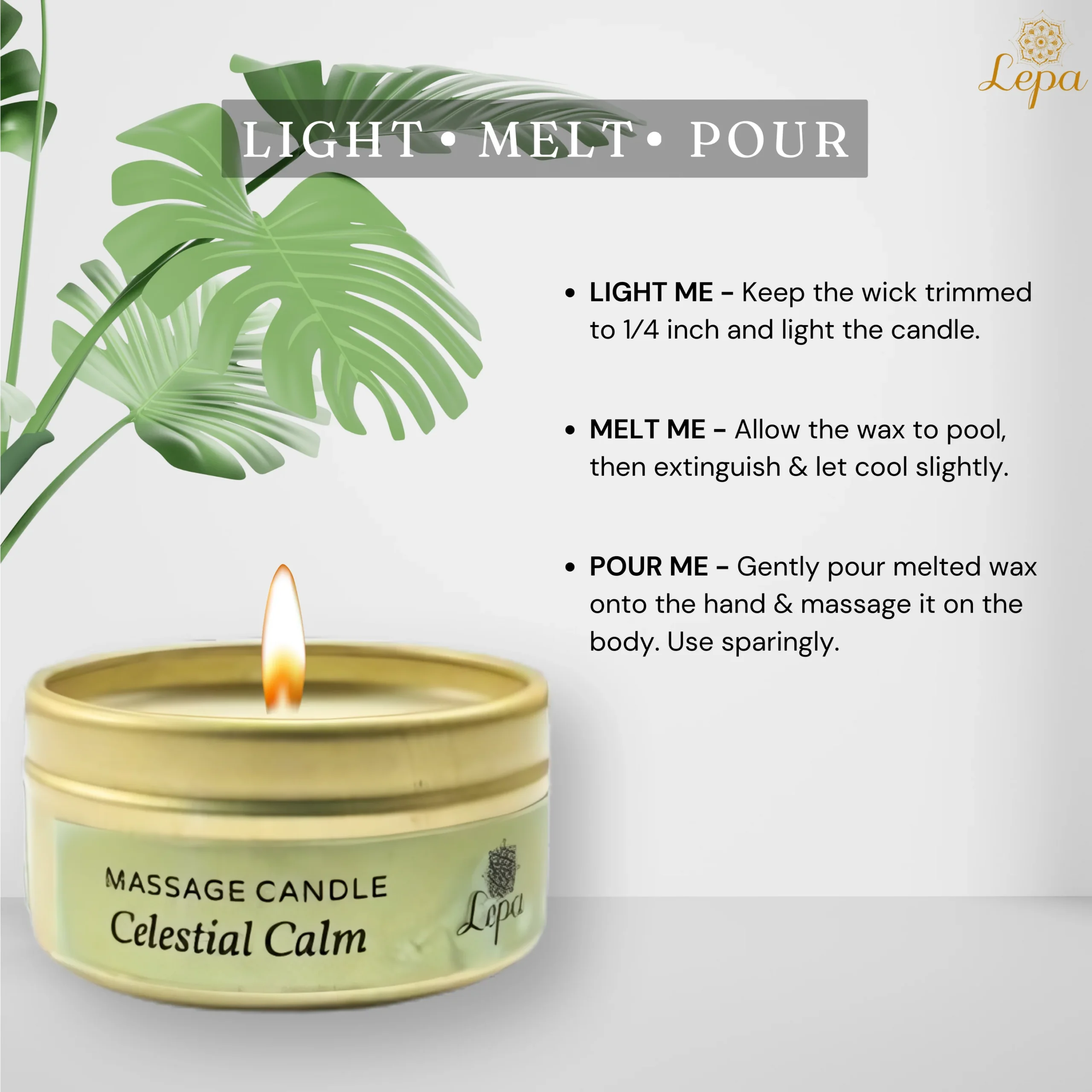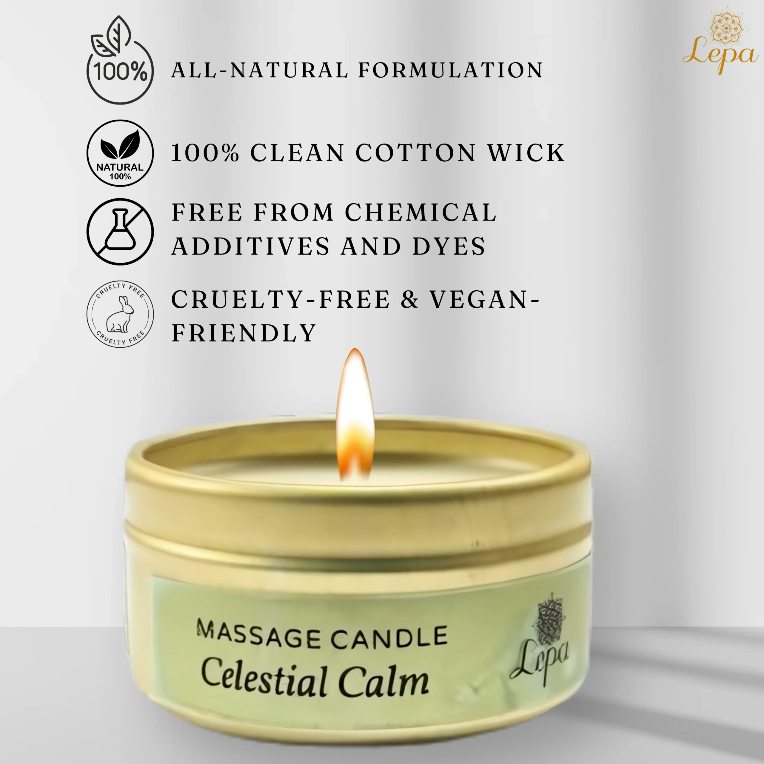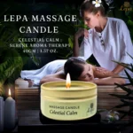 - Elegant Design: Encased in a Tin jar, the Lepa Celestial Calm Massage Candle adds a touch of elegance to Massage.